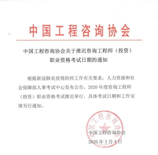 3月4日,中国工程咨询协会发布通知,根据疫情防控工作的有关要求,2020年度咨询工程师(投资)职业资格考试推迟举行,具体考试日期和工作安排另行通知。