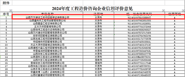 近日,山西省住房和城乡建设厅公布了2024年度工程造价咨询企业信用评价公示名单,我公司顺利通过2024年度审查,信用等级继续定级为A级(最高级)。