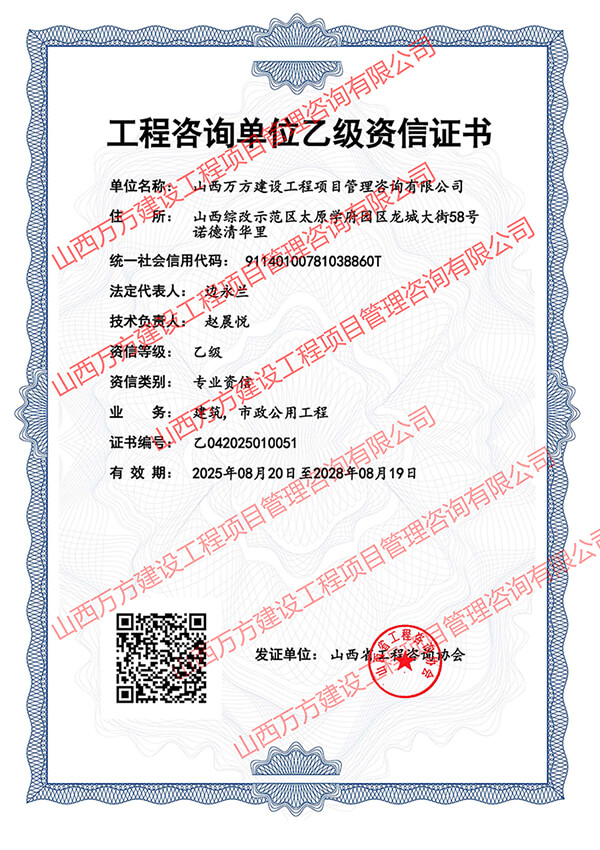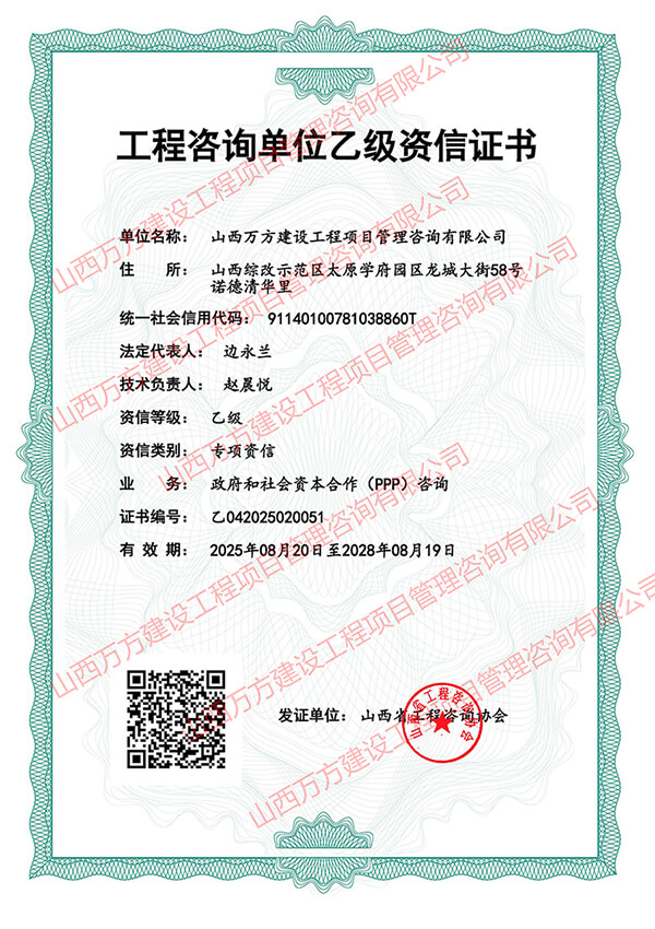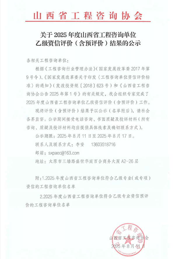 2025年8月20日,山西省工程咨询协会正式公布2024年持续符合及2025年符合乙级资信评价标准的工程咨询单位名单。我公司凭借深厚的专业积淀、规范的服务体系与过硬的综合实力,顺利通过建筑专业乙级资信、市政公用工程专业乙级资信及PPP专项乙级资信三项评价,这标志着公司在相关领域的技术能力与服务水平获得行业权威的高度认可。