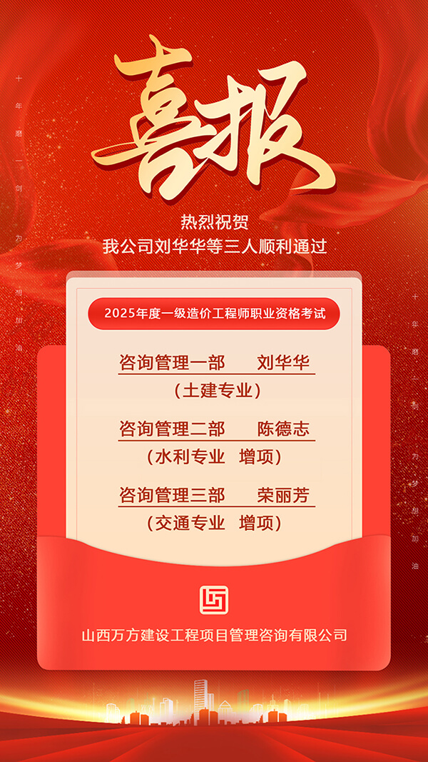 您当前的位置:新闻动态 > 公司新闻 > 热烈祝贺我公司3人顺利通过2025年度国家一级造价师职业资格考试