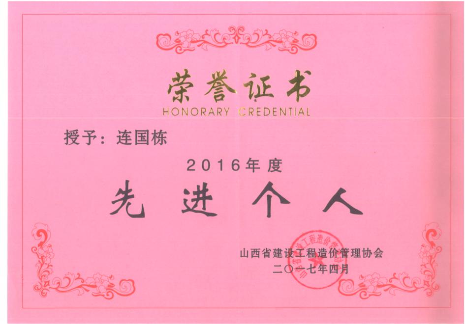 > 连国栋山西省工程建设造价管理先进个人荣誉证书