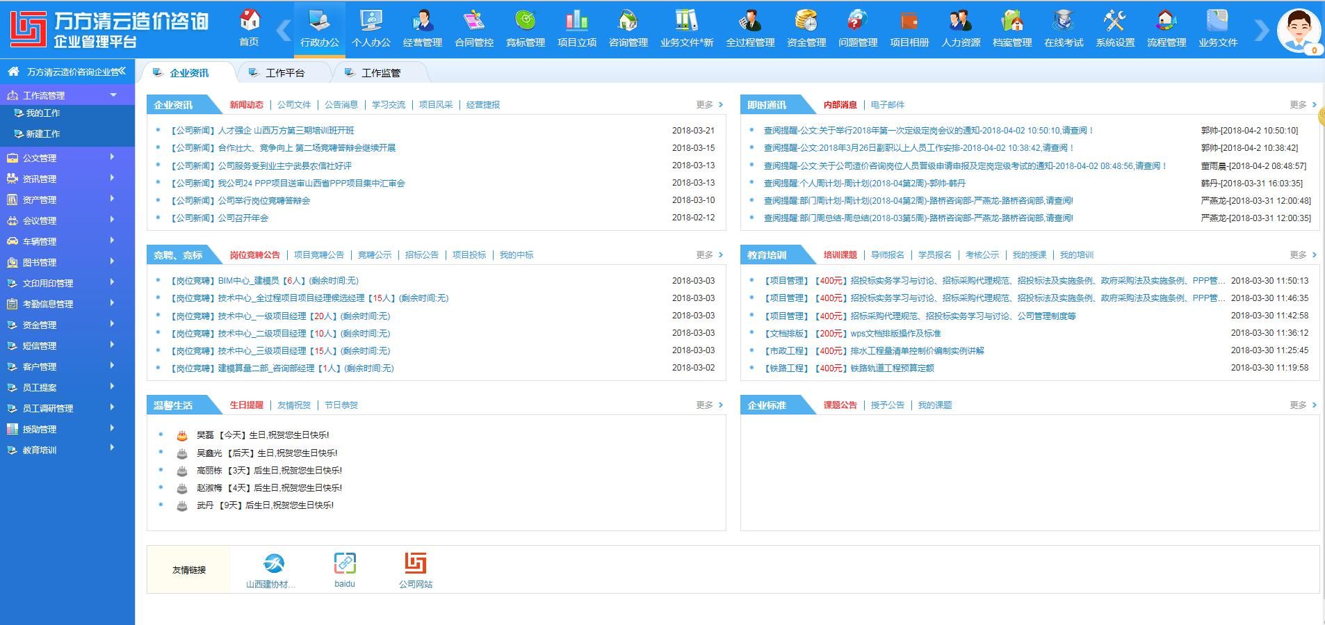 2018年4月9日,北京中昌工程咨询有限公司董事长郭怀君一行来我公司就“万方青云企业管理平台”软件进行交流学习。公司总经理连国柱、软件研发部部长李小庭及成员索钒耀进行了对平台的讲解和接待。