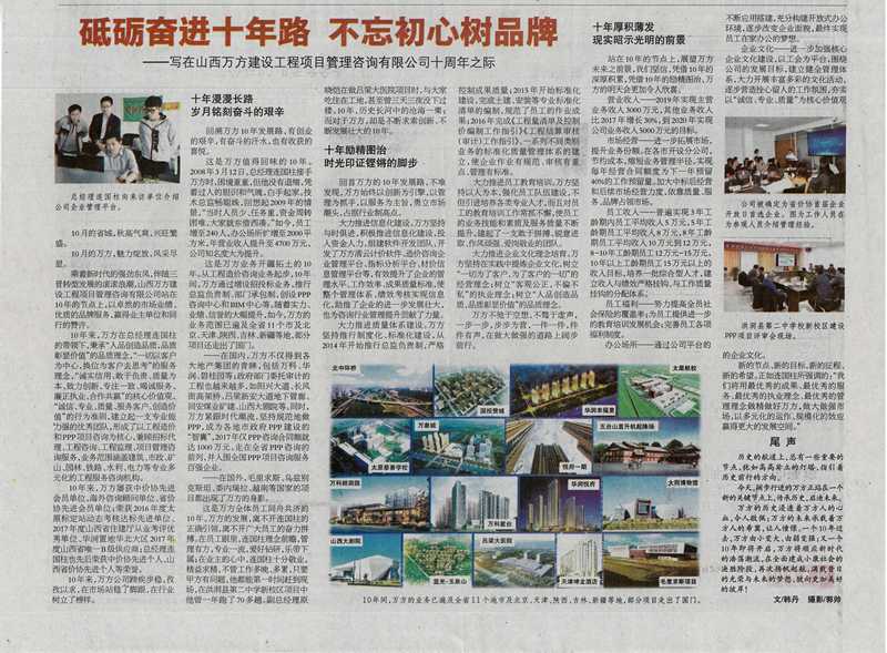 乘着新时代的强劲东风,伴随三晋转型发展的滚滚浪潮,山西万方建设工程项目管理咨询有限公司站在10年的节点上,以卓然的市场业绩、优质的品牌服务、赢得业主单位和同行的赞许。