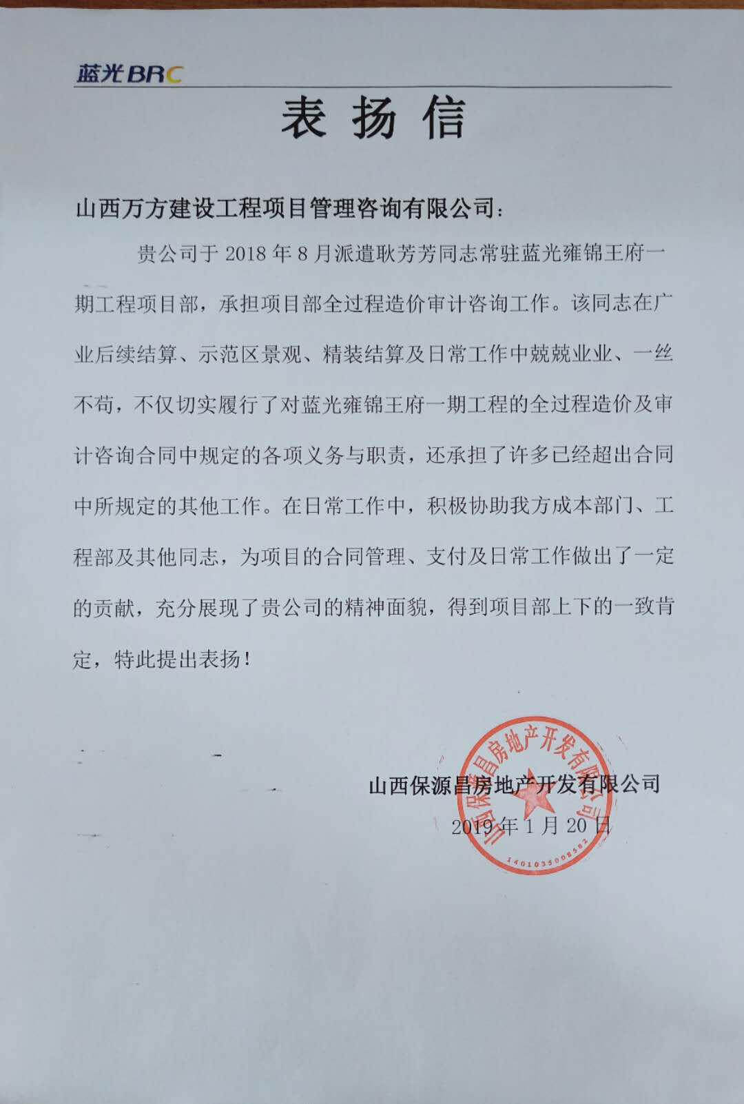 会议中特意对项目经理耿芳芳同志提出表扬,该同志自担任蓝光项目项目经理以来对待每一项工作一丝不苟,兢兢业业,不仅切实履行了对蓝光项目一期工程全过程造价及审计合同中规定的各项义务与职责,还承担了许多超多合同的工作,充分展现了我公司的精神面貌,得到甲方成本及项目人员的一致肯定!
