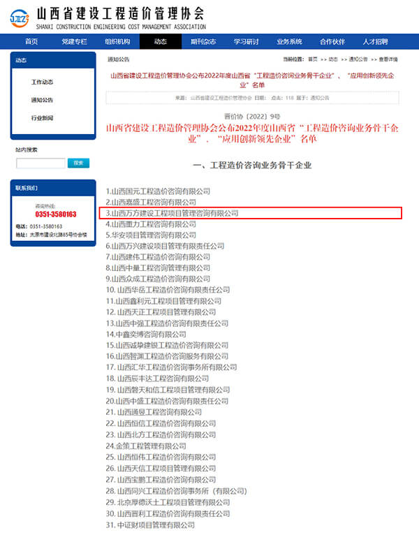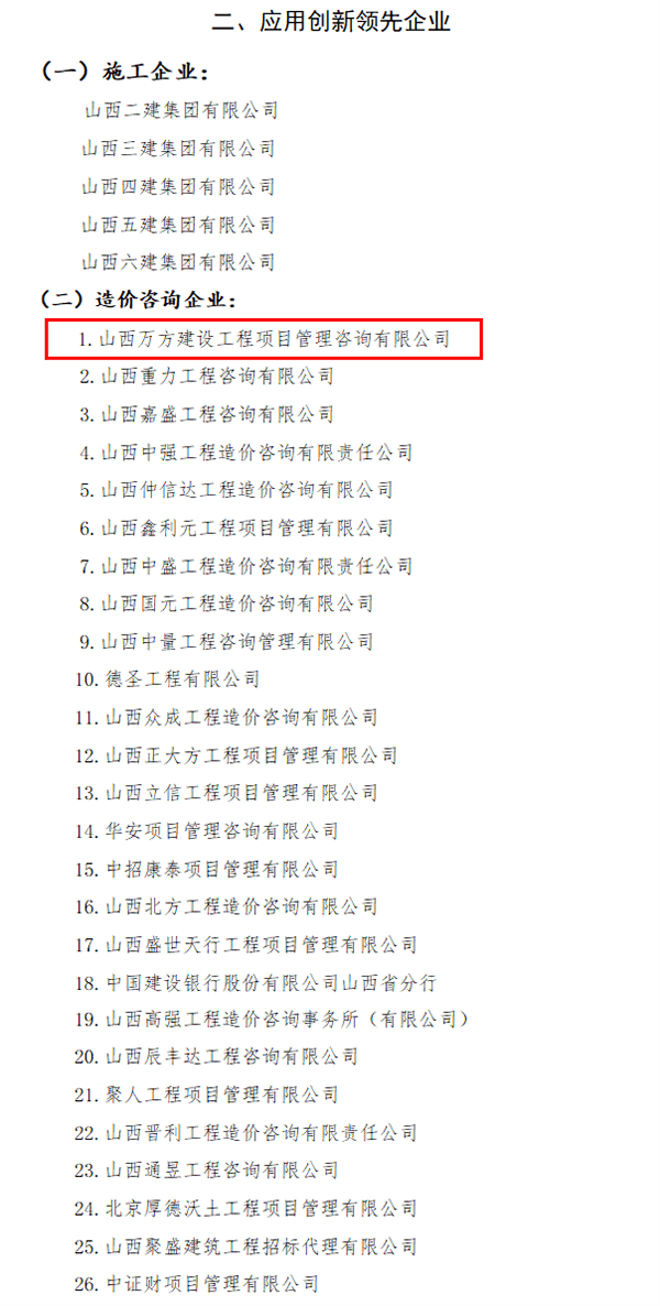 2022年05月19日,山西省建设工程造价管理协会公布2022年度山西省“工程造价咨询业务骨干企业”、“应用创新领先企业”名单,覆盖全省工程造价咨询企业30余家,其中山西万方在“工程造价咨询业务骨干企业”、“应用创新领先企业”排名分别为第三名、第一名。
