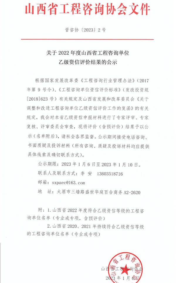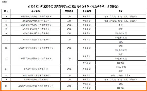 2023年1月6日,山西省工程咨询协会公布了关于2022年度工程咨询单位的乙级资信评价结果,其中山西万方在建筑、PPP咨询两个专业被评定为乙级资信。