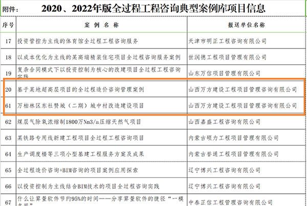 1月5日,中国建设工程造价管理协会公布了2020年和2022年全过程工程咨询典型案例项目信息。全国共报送212篇典型案例,我公司2个项目荣居其列,分别为《基于某地超高层项目的全过程造价咨询管理案例》、《万柏林区东社赞城(二期)城中村改造建设项目》。