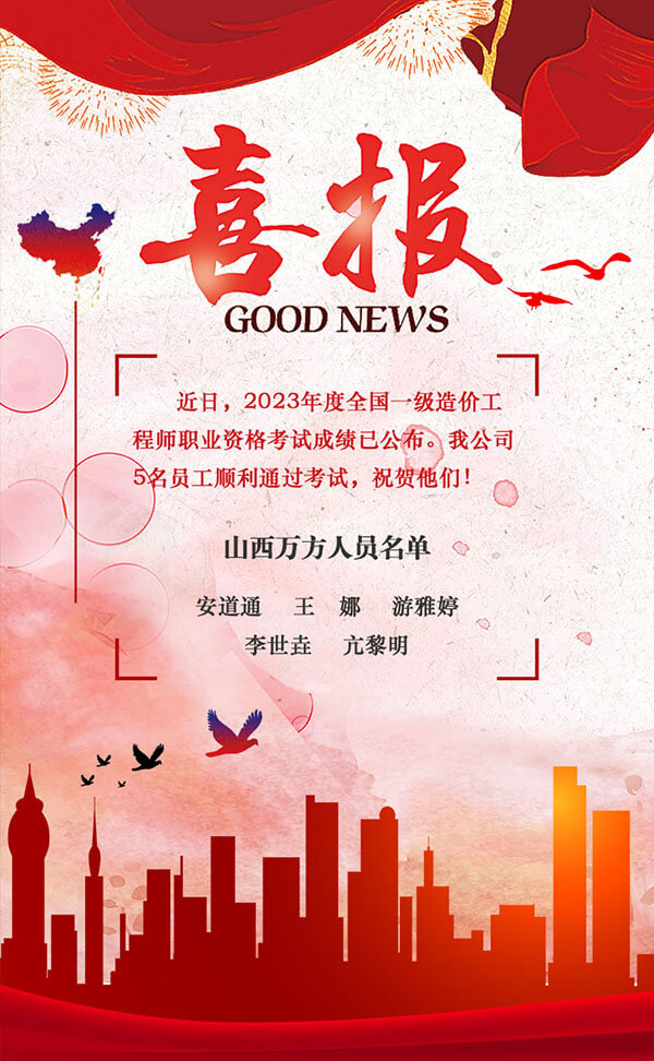 近日,2023年度全国一级造价工程师职业资格考试成绩已公布。我公司5名员工顺利通过考试,祝贺他们!