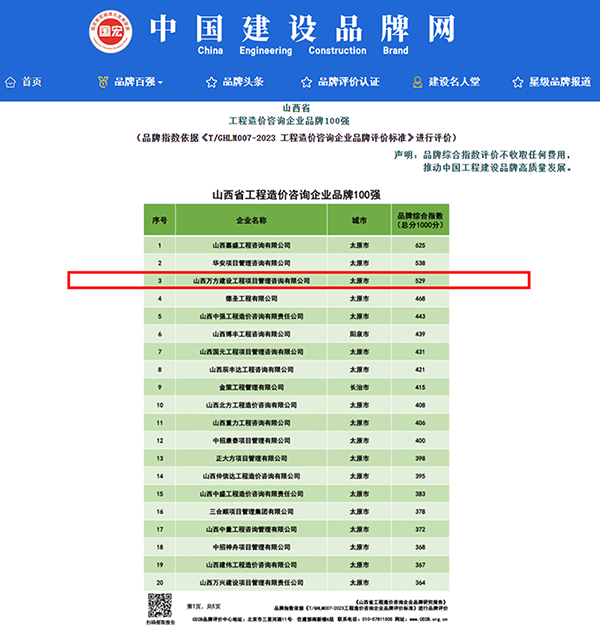 《世界财经》杂志(全球发行期刊)、建设品牌网.中国(WWW.CECB.org.cn)、CEBC中国建设传媒集团(中国首家工程建设品牌国际传播机构)、C1TV建审传媒、建新国际通讯社(城市建设国际通讯社)及80余家海内外媒体联合发布《山西省工程造价咨询企业品牌100强》名单。山西万方建设工程项目管理咨询有限公司以529的品牌综合指数评分荣获其列。