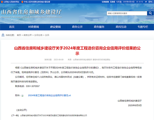近日,山西省住房和城乡建设厅公布了2024年度工程造价咨询企业信用评价公示名单,我公司顺利通过2024年度审查,信用等级继续定级为A级(最高级)。