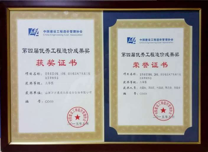日前,中国建设工程造价管理协会发布了"关于第四届优秀工程造价成果奖评选结果公示”(中价协(2015)11号文)的文件,公示了单位与个人获评工程造价优秀成果,我公司推荐报送的“旺景家园1#楼、2#楼、综合楼及地下车库工程结算审核报告”获得了三等奖的好成绩,并成为山西省唯一一家获得此殊荣的造价咨询公司。